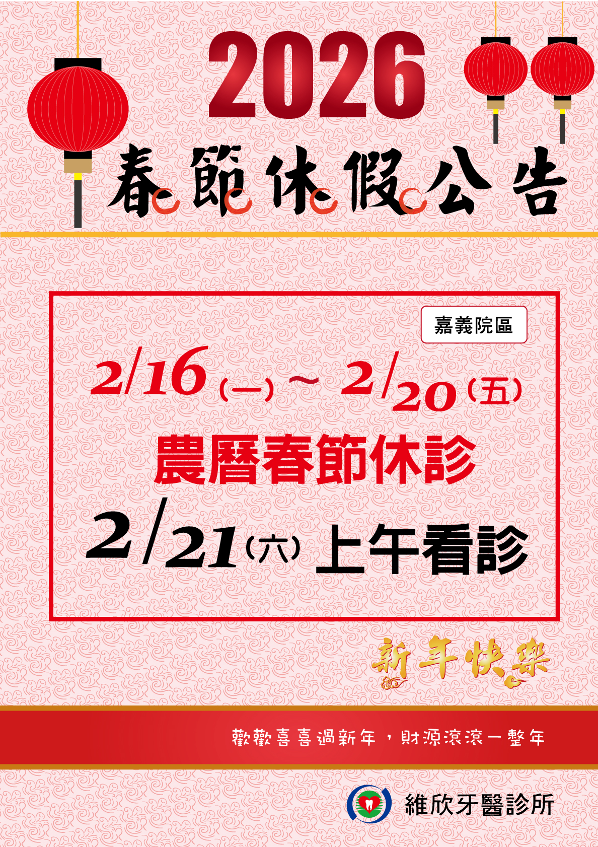 【嘉義院區春節休診公告】 親愛的朋友 農曆新年快樂 春節期間, 嘉義院區診所自2/16至2/20休診, 2/21(六)上午看診 門診於2/23星期一全面恢復正常看診。 祝您新年快樂,身體健康。 高雄維欣牙醫診所